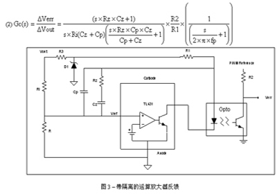 在设计包含PWM而不含电压放大器的电源设计时,系统设计人员可采用并联稳压器作为廉价的运算放大器。图2给出了这种应用的功能结构图。方程式1解释了这种补偿网络的小信号传输函数的数学原理。